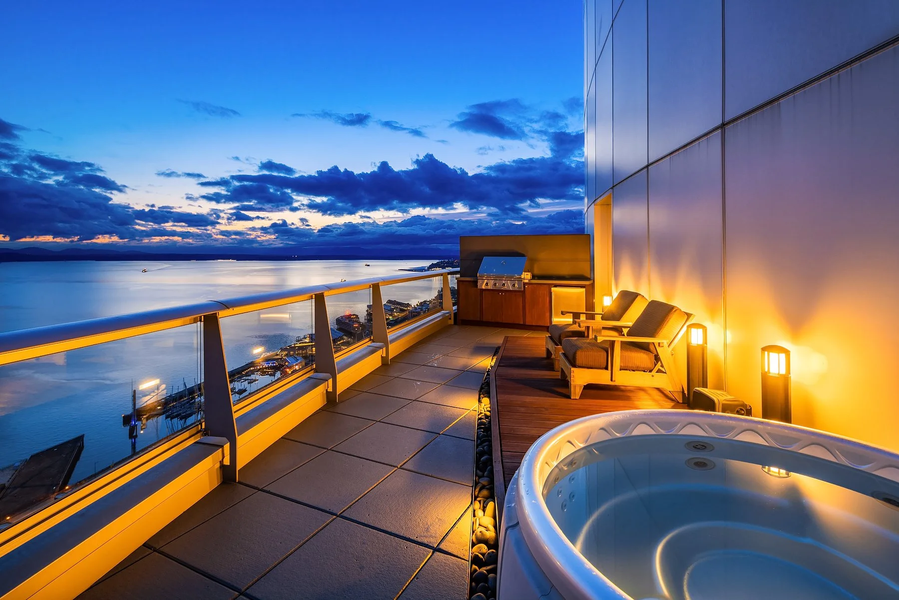 At 440 feet, the highest private residential rooftop in Seattle features sweeping views of Elliott Bay, The Olympic Mountains and Seattle Skyline